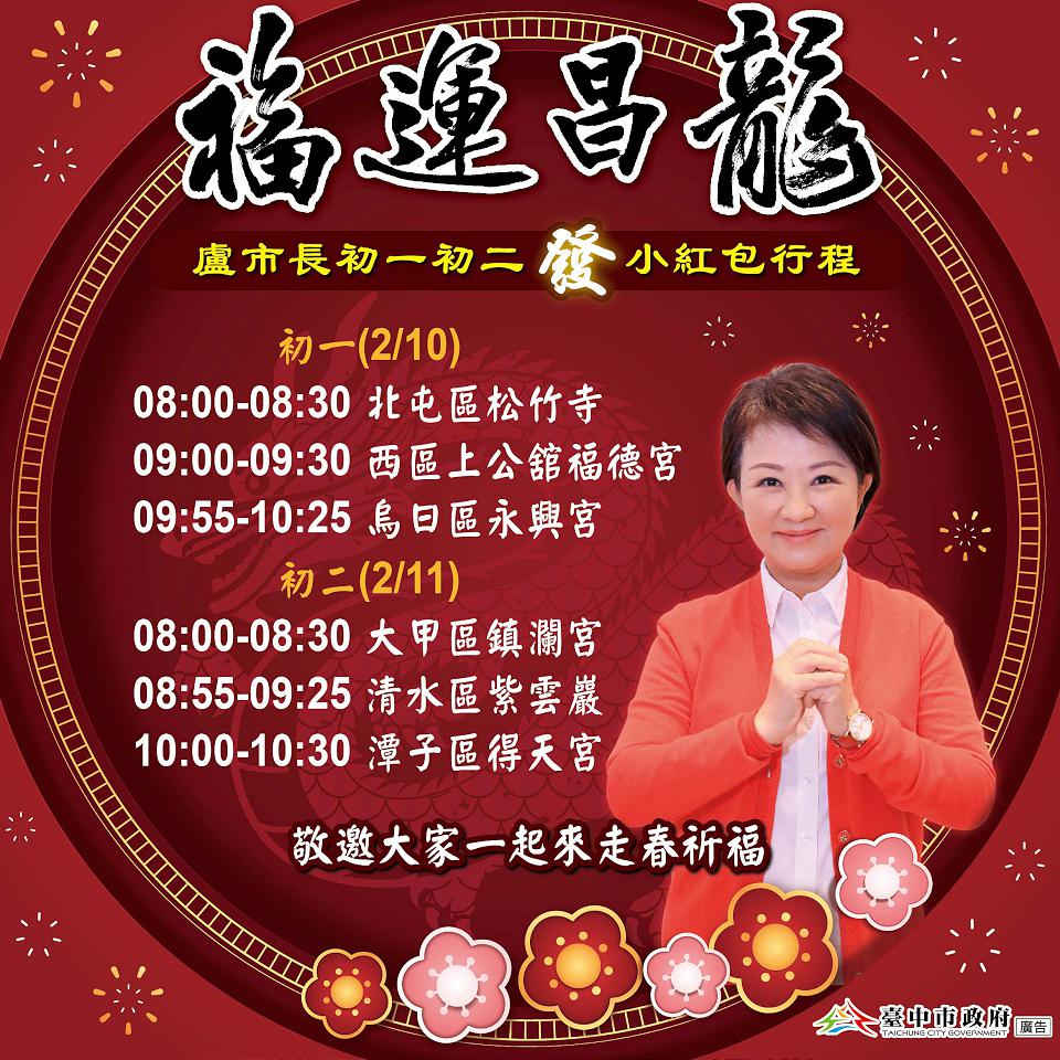 民政局長吳世瑋表示,今年盧市長共安排6場發紅包行程,2月10日上午8時起將前往北屯松竹寺、西區上公舘福德宮、烏日永興宮發送小紅包;11日上午8時起則至大甲鎮瀾宮、清水紫雲巖、潭子得天宮發送,想拿到龍年開運紅包的朋友,記得到宮廟走春,領紅包討吉利,並祝福所有民眾,新的一年龍保安康、平安喜樂。