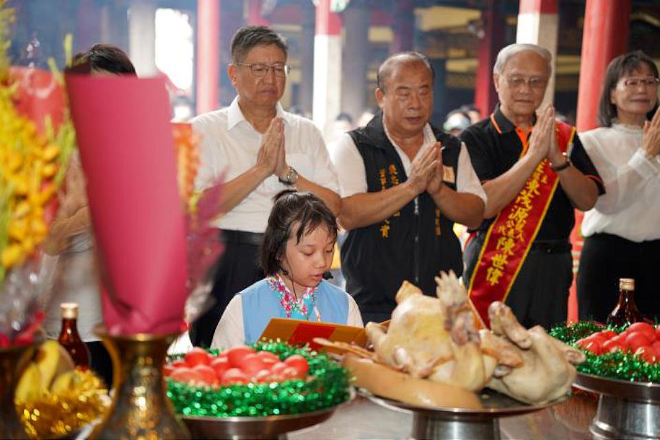 「義魄千秋2023全國義民祭在新竹縣」義民祭啟動儀式24日在新竹縣新埔褒忠義民廟登場,來自新埔國小四年級學生范于霏,在典禮中以流利客語朗讀祝文,她純熟的海陸腔客語及沉穩表現,顯示新竹縣從小扎根、推廣客語的成效。