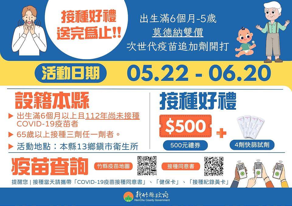 全國COVID-19疫情近期呈緩升趨勢,併發症及死亡個案多具慢性病史及未接種滿3劑疫苗者,新竹縣衛生局防疫不鬆懈,針對設籍新竹縣兩類對象長輩、未滿6個月嬰兒,能儘速完成疫苗接種,降低重症及死亡風險,只要到13鄉鎮市衛生所完成疫苗接種,即可獲得500元商品禮券及4劑快篩試劑。