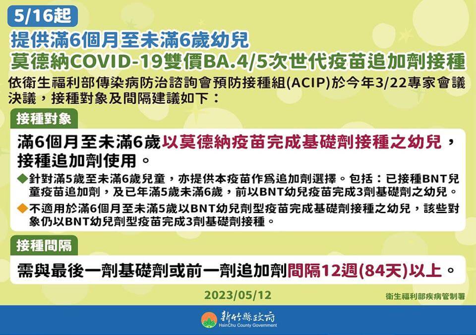 衛生局提醒有關幼兒追加劑型莫德納雙價BA.4/5次世代疫苗型莫德納雙價BA.4/5次世代疫苗,接種對象為滿6個月至未滿6歲以莫德納疫苗完成基礎劑接種幼兒及滿5歲至未滿6歲兒童,已接種Pfizer-BioNTech兒童疫苗追加劑的幼兒,以及已年滿5歲未滿6歲前以Pfizer-BioNTech幼兒疫苗完成3劑基礎劑的幼兒,皆可選擇該疫苗為接種追加劑。