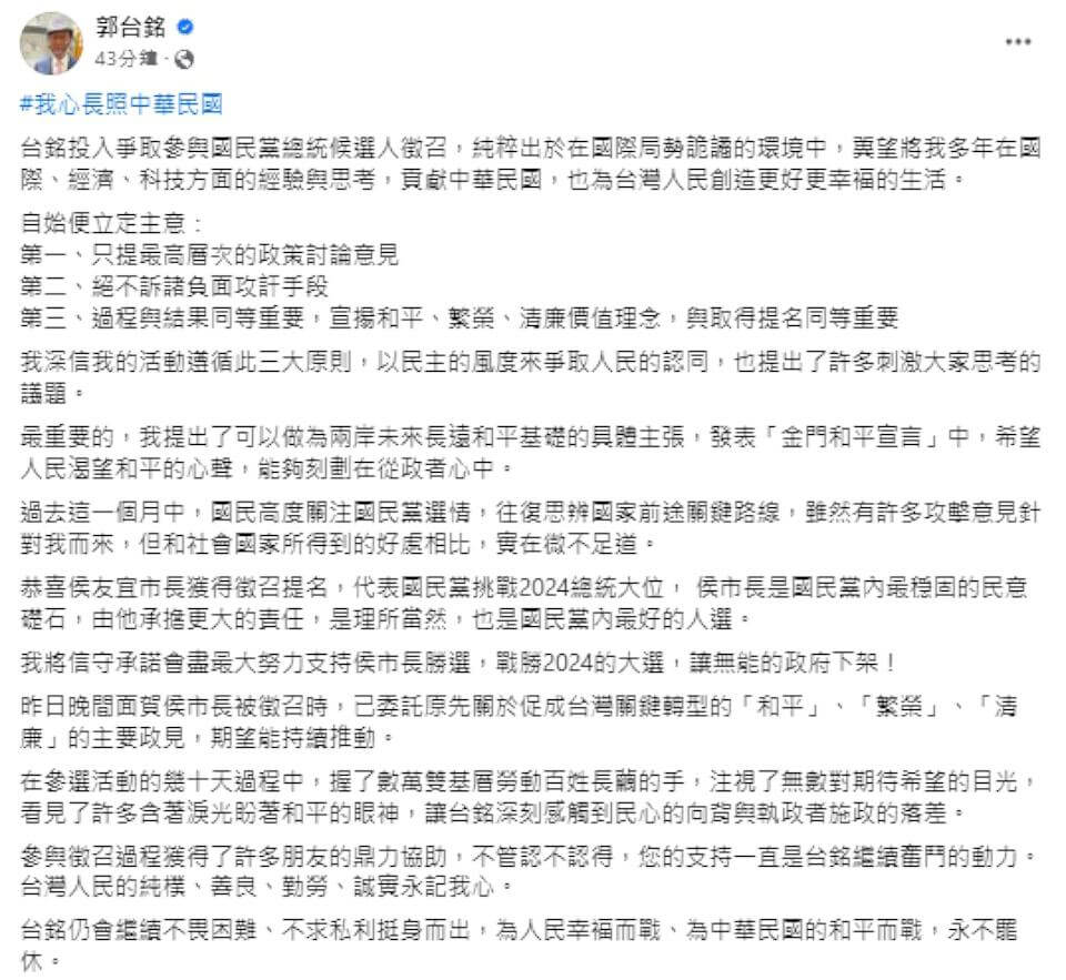 郭台銘在臉書粉絲頁貼文中提及,在16日晚間當面恭賀侯友宜市長獲得徵召,就已經得知自己要信守承諾,幫國民黨贏得2024總統大選,雖然在參選活動過程中,握了數萬雙基層勞工長繭的手,也看見無數期待、含淚、盼望和平的眼神,深刻感受到民心的向背,所以將原先促成台灣關鍵轉型的「和平」、「繁榮」、「清廉」的主要政見,期望侯友宜市長能持續推動。