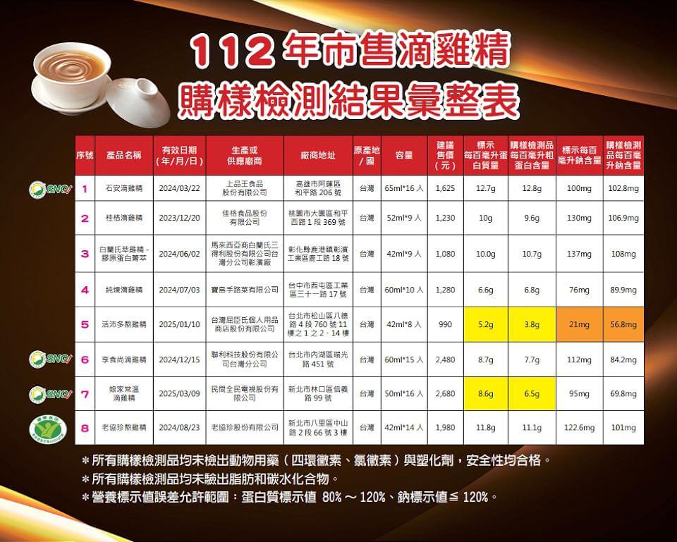 消保官表示,「包裝食品營養標示應遵行事項」規定營養標示值之容許誤差範圍為正負20 % ,食安法第28條規定食品包裝之標示不得有不實、誇張或易生誤解之情形,這次抽驗的8款滴雞精產品,有2款成分標示誤差較大,「活沛多熬雞精」檢驗出蛋白質含量(每100毫升3.8公克)未達標示含量(每100毫升5.2公克)的80%,鈉含量(每100毫升56.8毫克)則超過其標示含量(每100毫升21毫克)達170%;另外還有「娘家常溫滴雞精」之蛋白質含量(每100毫升6.5公克)未達標示含量(每100毫升8.6公克)的80%。