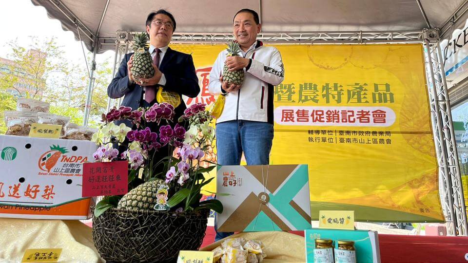 新北市板橋區農會超市前廣場日前(13日)展售台南鳳梨及農特產品,為新北市民帶來當季的新鮮鳳梨及鳳梨乾、鳳梨酥等,新北市長侯友宜、台南市長黃偉哲都到場聯手促銷,果然南北市長串聯魅力無限,84噸鳳梨一銷而空,讓台南農民笑呵呵,新北市民甜蜜蜜,想嚐鮮的朋友可到新北市各地農會選購。