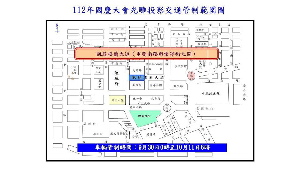 112年國慶籌備委員會訂於9月25日至26日、27日至28日、10月6日至7日、9日在總統府前及周邊道路實施參演單位夜(晝)間劃線作業,另9月29日至10月11日執行光雕投影等活動。台北市警局為維護各項活動及工程施作期間之交通安全,實施相關道路交通管制,時間及範圍如下(視狀況提前或延後):