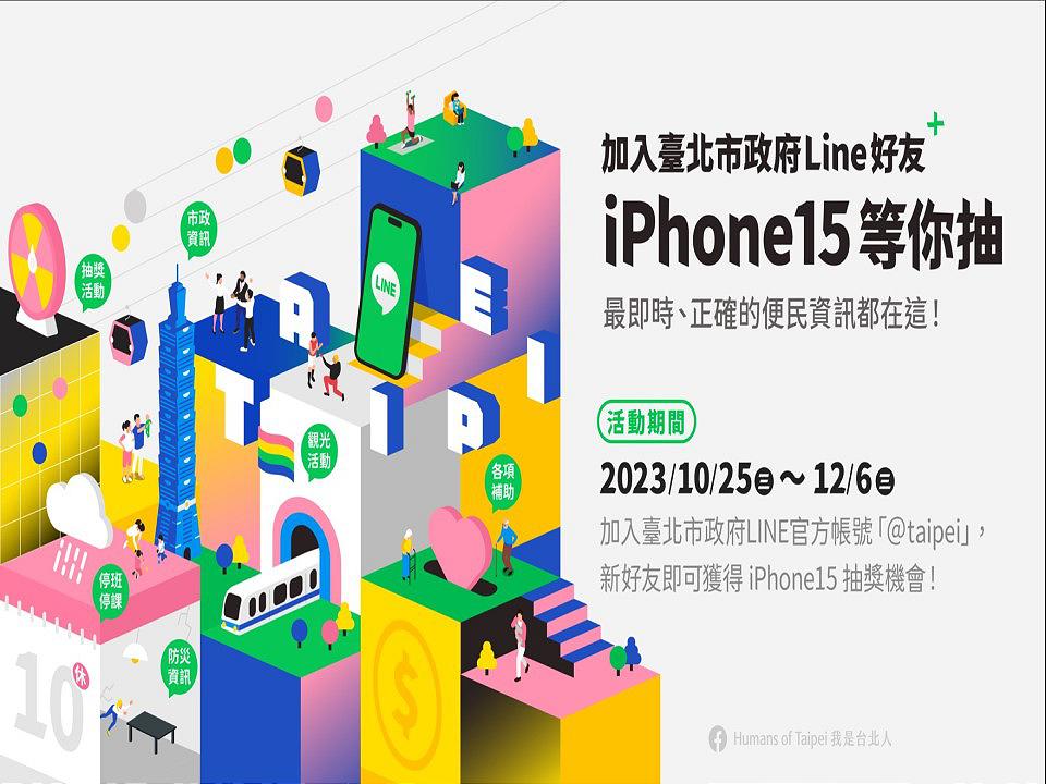 想一手掌握最即時、最正確的台北大小事,透過「台北市政府」LINE官方帳號一手掌握最準確的官方消息!無論是當颱風天災發生,大家最關心的停班停課即時訊息,以及台北市各式精彩活動、熱門旅遊景點、補助申請資訊等,都能即時掌握資訊,台北市觀傳局推出「加入台北市政府LINE好友 iPhone 15等你抽!」線上活動,將抽出3位幸運的新好友,送出最新的iPhone 15。