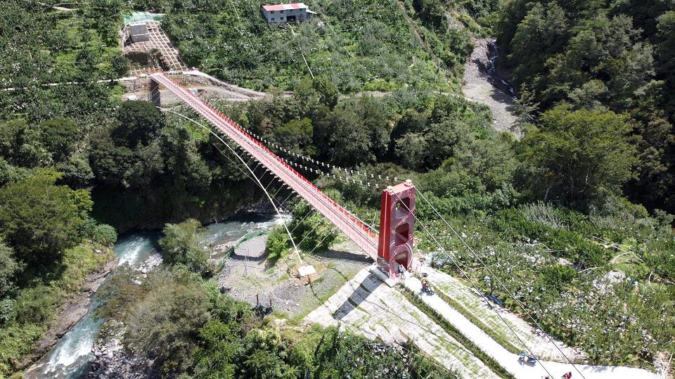 台中市和平偏遠地區交通受限天然地勢影響,過去僅靠「流籠設施」載運人力及農產品往返,建設局編列經費5750萬元辦理「和平區環山部落南湖溪新建吊橋」工程,終於在今年6月完工,台中市長盧秀燕21日視察,這座吊橋是讓附近農民能有安全、便捷回家的路,也非常感謝部落長老宋進玉無償提供土地使。
