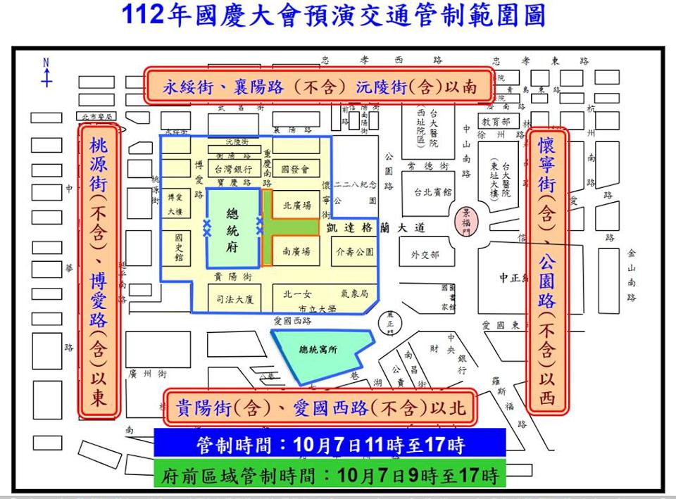 112 年國慶籌備委員會10月7日將在總統府前,舉辦「國慶大會預演」活動,台北市警察局為維護活動交通秩序與安全,將於當天9時至17時進行道路管制,將是預演情況提前或延後管制時段。