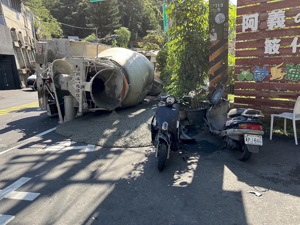 警方初步調查,預拌混泥車游姓駕駛(40歲)當時由新店往烏來方向行駛,在新烏路1段的下坡專彎處,疑似操作不當整輛車往右翻覆,撞擊路邊電桿及紐澤西護欄,車頭嚴重變形駕駛受困車內,當時1名行經路人(蘇姓男子(70歲)遭水泥噴濺受輕傷,另外還有2部機車受波及。