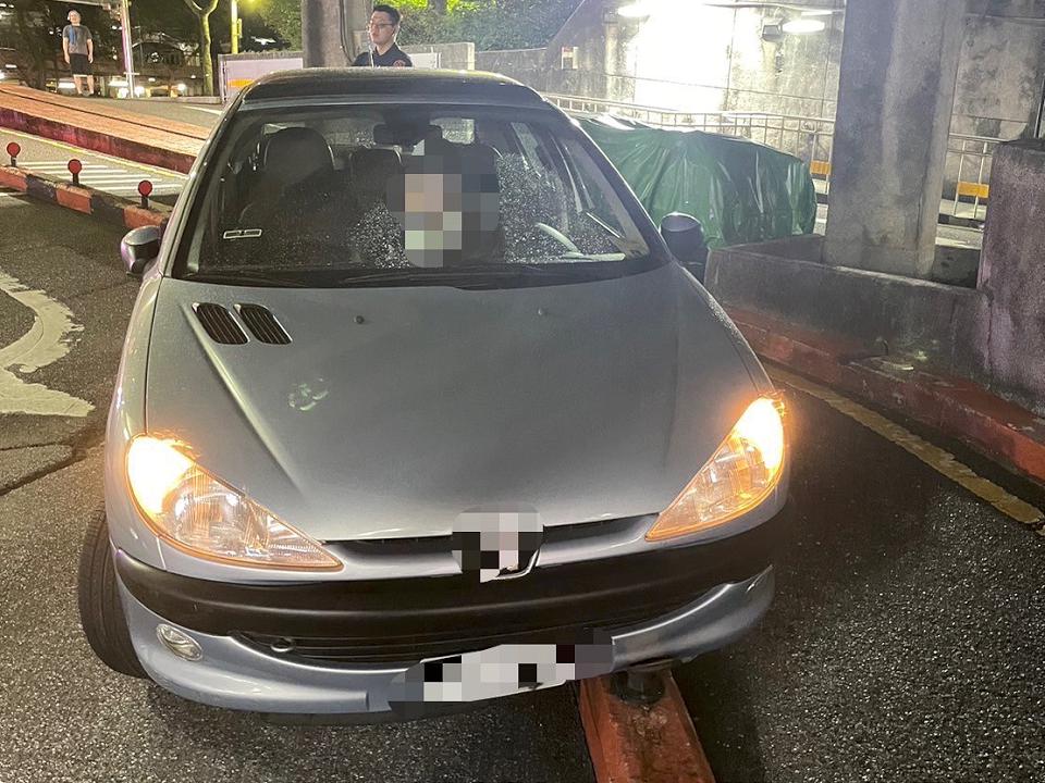 林男酒後開車,進地下停車場時,將車輛「騎」上分隔島。讀者提供