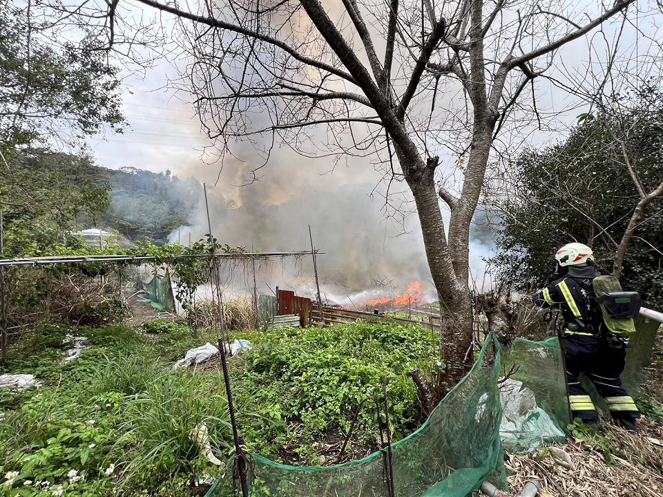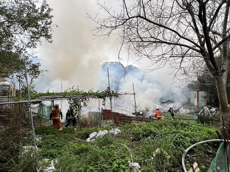 這間雞舍是以木造加鐵皮搭建,因此火勢迅速延燒,警消抵達現場時,已經陷入火海中,由於雞舍內堆放著農具雜物,還養著40多隻蛋雞,還好有3支瓦斯鋼瓶被及時搬出,沒有釀成更大的災害,經過約15分鐘搶救火勢完全撲滅,對於雞舍為何會起火燃燒,還有待火調人員鑑識。(記者陳品綸/桃園報導)