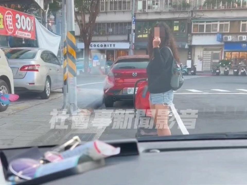 女子推嬰兒車疑似人肉佔車位,遭駕駛提醒後不爽,比出不雅手勢。翻攝社會事新聞影音