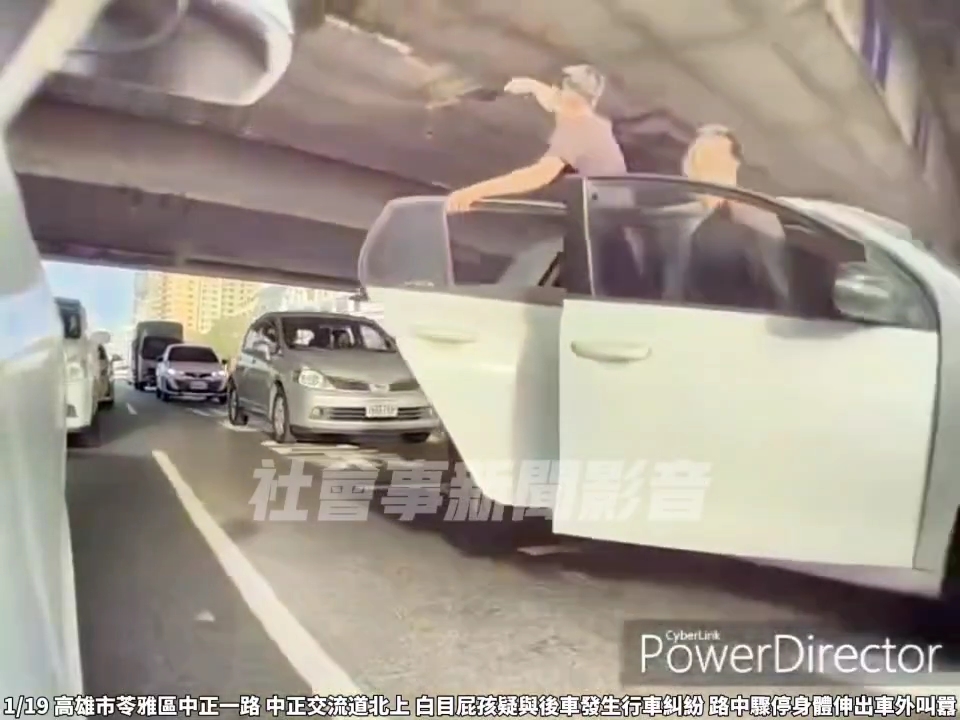 高雄市街頭19日上午竟發生轎車內的2名男子,趁車輛停在車道等待左轉時,突然開啟車門站在門框上對著後方車輛叫囂,整個過程被路過車輛行車紀錄器拍下,警方檢視畫面後表示,認為這樣的行為已經違反道路交通管理處罰條例,將根據車號進行調查開罰。