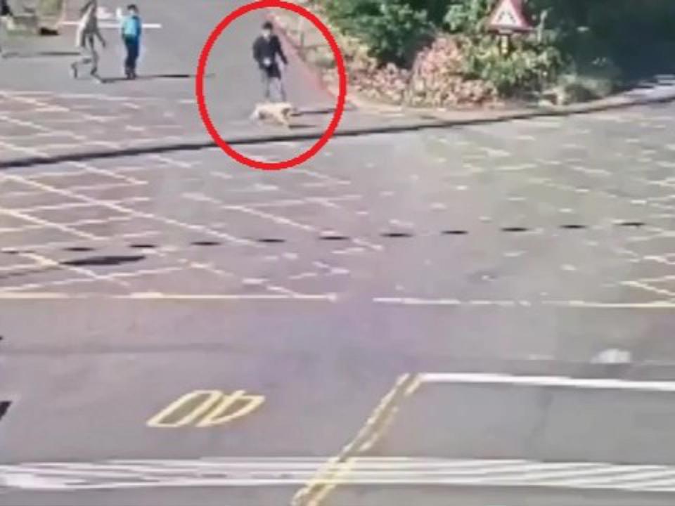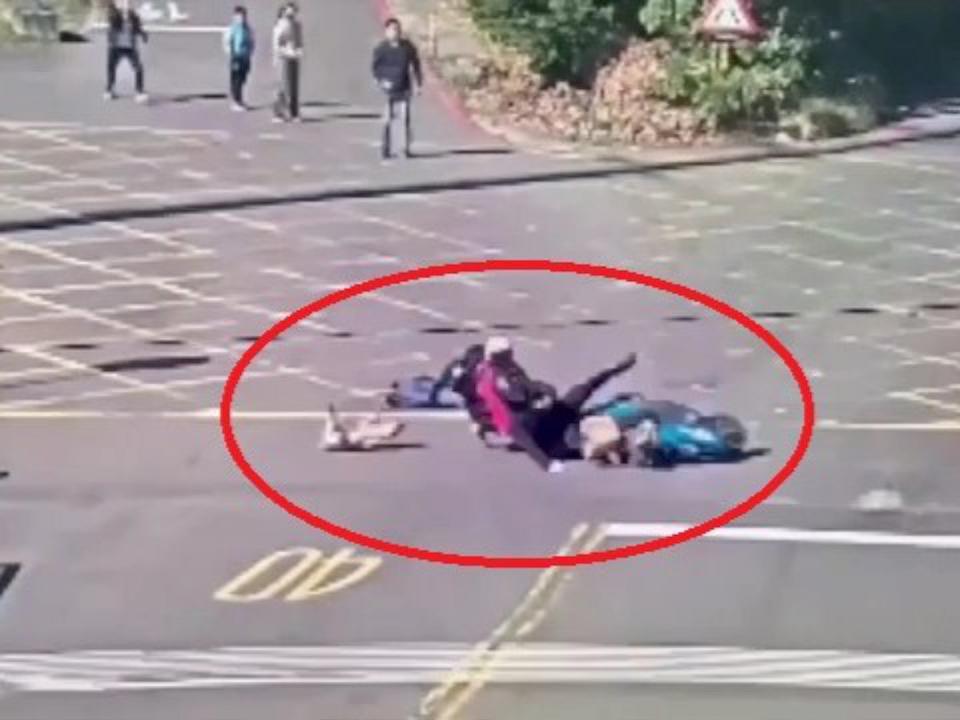 根據監視器畫面,當時倪姓男子一家人牽著狗散步,接近路口時毛小孩突然掙脫綁繩,一股腦就往道路暴衝,正巧曹姓騎士載張姓女乘客行經,由於事發突然讓曹男來不及反應,機車直接撞上毛小孩,2人1狗就在路中翻滾好幾圈,毛小孩受到驚嚇隨即逃離現場,倪男一家人趕緊上前協助受傷的2人,並協助報警送醫。