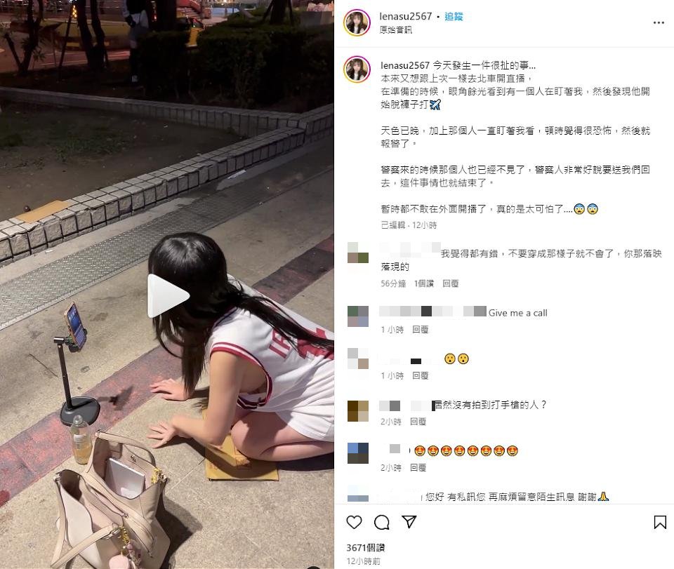經常在IG上PO出自己姣好身材的網紅玲奈Lena,也經常在網路上開直播與網友互動,但1日晚間她在IG上貼文,指出自己與在台北車站旁準備進行直播時,眼角餘光看到一旁樹下的黑暗處,有1名男子直盯著她看,沒多久這名男子竟當著她們的面前,直接脫下長褲後,直接做出不雅動作,讓玲奈Lena嚇到花容失色,當場放棄直播。