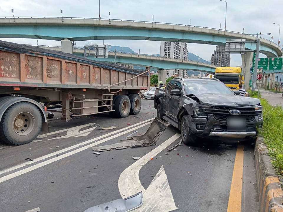 新北市台64線台北港匝道口,6日10時許發生嚴重車禍,1輛砂石車疑似煞車失靈,直接衝撞前方7部大小車輛,其中1輛大型重機後座女乘客,受困車下已經失去生命跡象,警消將人救出後緊急送醫,由於車禍現場佔據匝道全線車道,警方封閉路段引導提前改道。