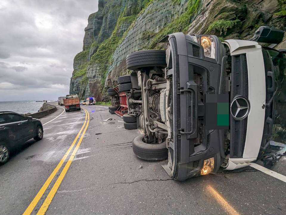 貨櫃車駕駛疑似操恐失當,讚台2線83.4K彎道翻覆。讀者提供
