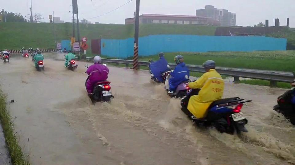 五股疏洪十路機車陸上行舟。讀者提供