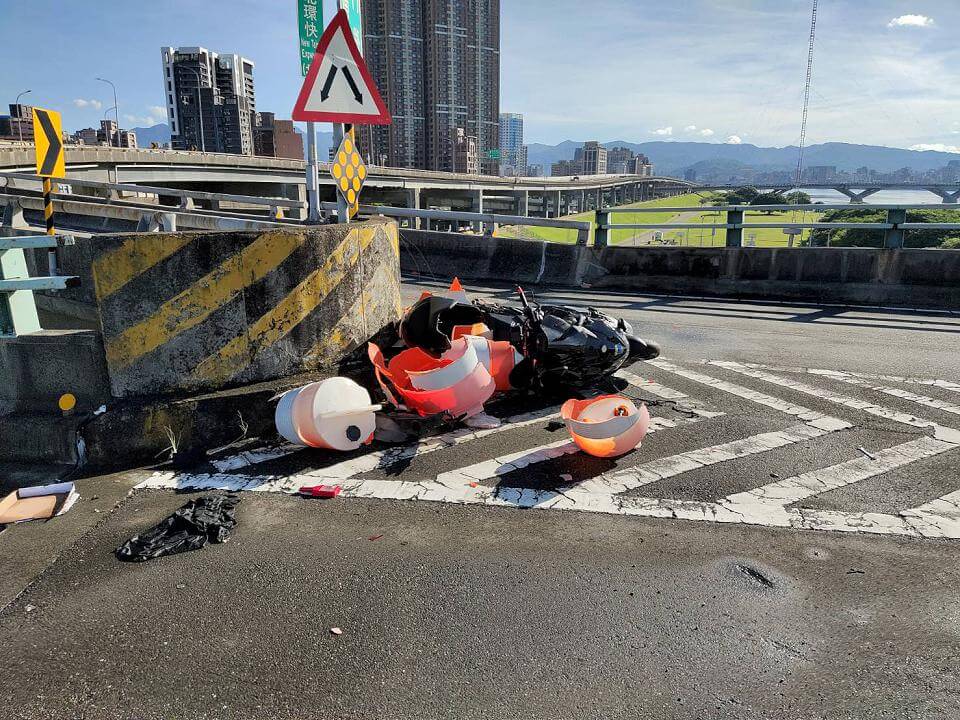 黃牌重機車殼碎片散落,橋上分道警示桶也破碎。畫面讀者提供