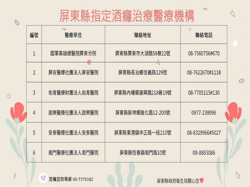 酒精成癮為高度復發之慢性疾病,僅靠意志力無法根除酗酒意念,為了協助解決酒精成癮所造成之家庭及社會治安問題,屏東縣政府衛生局結合轄內屏安醫院、佑青醫院、安泰醫院、迦樂醫院、南門醫院及國軍高雄總醫院屏東分院等6家醫療機構投入酒癮治療服務,藉由專人媒合至合作醫療機構進行完整的評估及治療,提供一條龍服務,讓戒酒癮民眾免於奔波。