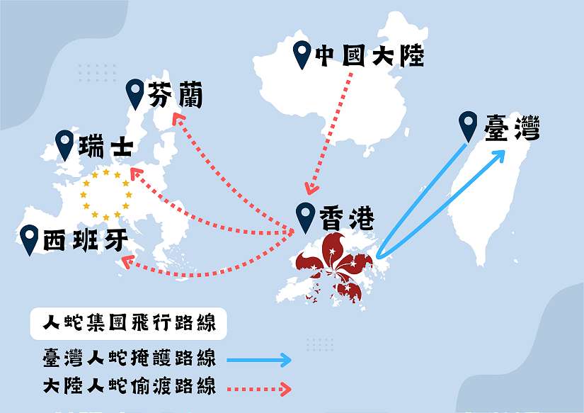 國境事務大隊分析該人蛇集團犯罪手法,主要以前往香港澳門換取免費機票與旅遊,當天或隔天即可返國等噱頭,且返國後還可以領取新臺幣1萬元至1萬5千元報酬,招攬貪圖不法利益或不曾出國的國人,男女一組喬裝成情侶,先在桃園機場劃位取得前往歐洲國家的2段登機證,前段由臺灣人頭搭機前往香港,趁等候轉機期間,再將後段登機證交付給大陸人蛇冒名搭機偷渡前往歐洲。本案經逐一篩濾航空公司艙單,其中不乏食髓知味並連續多次出國掩護偷渡之國人,經分析犯罪關聯性,逐步清查出該人蛇集團從107年起,持續每月利用人頭從桃園機場掩護人蛇前往芬蘭、瑞士、西班牙等國,一直到COVID-19疫情爆發,因各國相繼封閉國門才歇手,經查該掩護偷渡犯罪行為持續約2年半,已安排掩護出團23架次航班,非法掩護約百餘人次偷渡,不法獲利高達近千萬元。