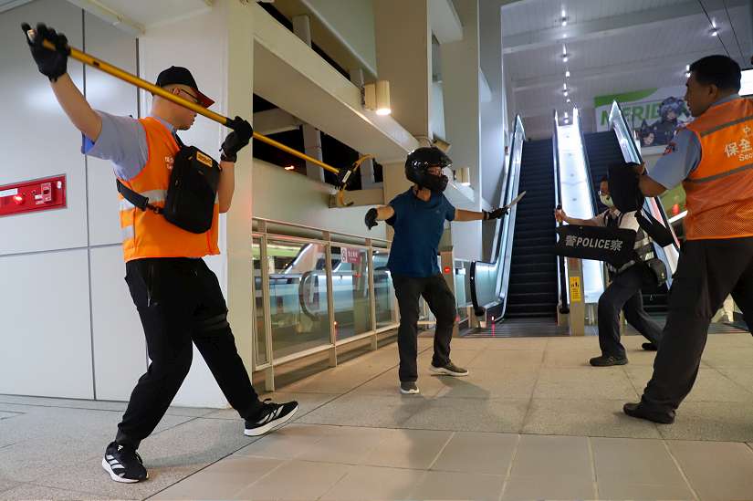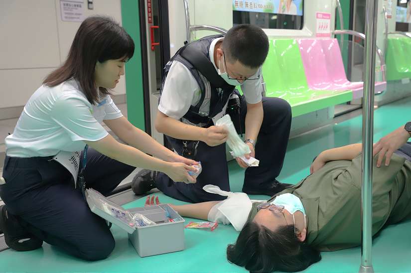 列車抵達市政府站後,站務人員緊急疏散旅客,統計回報受傷旅客人數及傷勢,第一時間進行傷患處置,並由行控中心通報救護車協助。站長與保全則在月台持續與歹徒對峙,保全近期新增隨身防割背包、防割手套及辣椒水等防護裝備,車站也增加配置防暴鋼叉,此次演練有助於提升第一線人員操作使用防護裝備的技能。