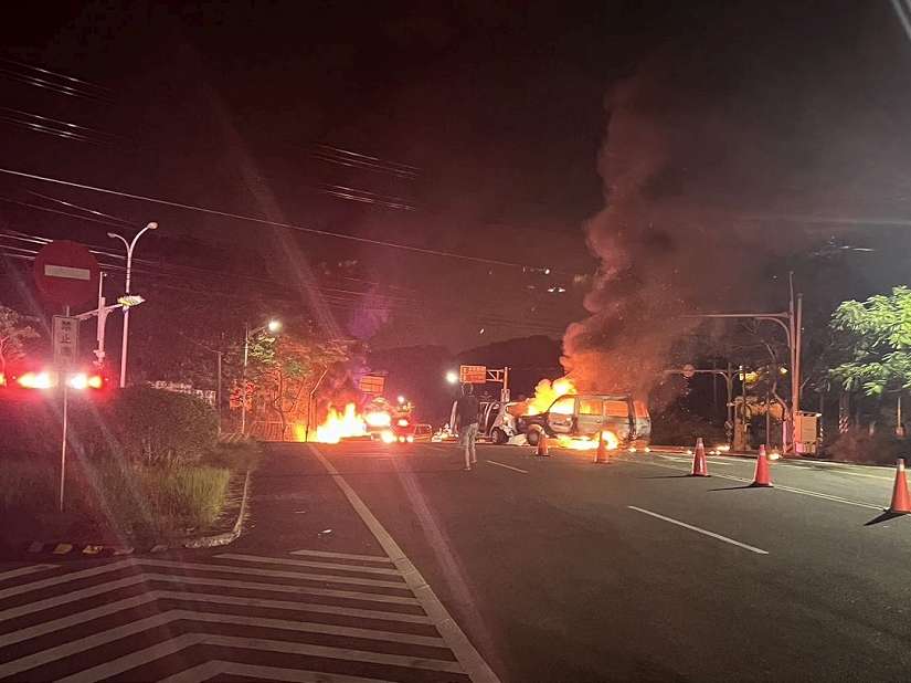 員警到場發現自小貨車緊貼自小客車並起火燃燒,1輛電動小客車卡在對向路旁同時燃燒,員警趕緊疏導車流,確保救護人員順利協助傷患,經初步了解,41歲姜男駕駛的電動自小客車沿苗栗縣造橋鄉苗8線由北往南行駛,行經台1線路口時疑似煞車不及,撞擊2輛停等紅燈,分別由54歲陳男駕駛的自小貨車及36歲陳女駕駛的自小客車,電動自小客車撞擊後滑行至對向路旁山壁,造成電動自小客車及自小貨車起火燃燒。