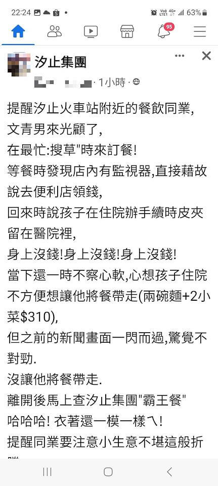「汐止集團」臉書有人貼出男子吃霸王餐,要同業小心不要被騙。翻攝汐止集團臉書