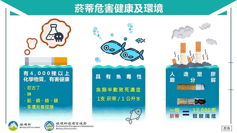 香菸看似由菸草與紙製成,不過,吸菸後留下的濾嘴,成分主要為醋酸纖維,進入自然環境後需要數十年甚至更長時間才能分解。在這期間,菸蒂會釋放出多種有害化學物質,包括尼古丁、重金屬和其他毒素,這些物質會滲入土壤和水體,對植物生長和水生生物構成嚴重威脅。