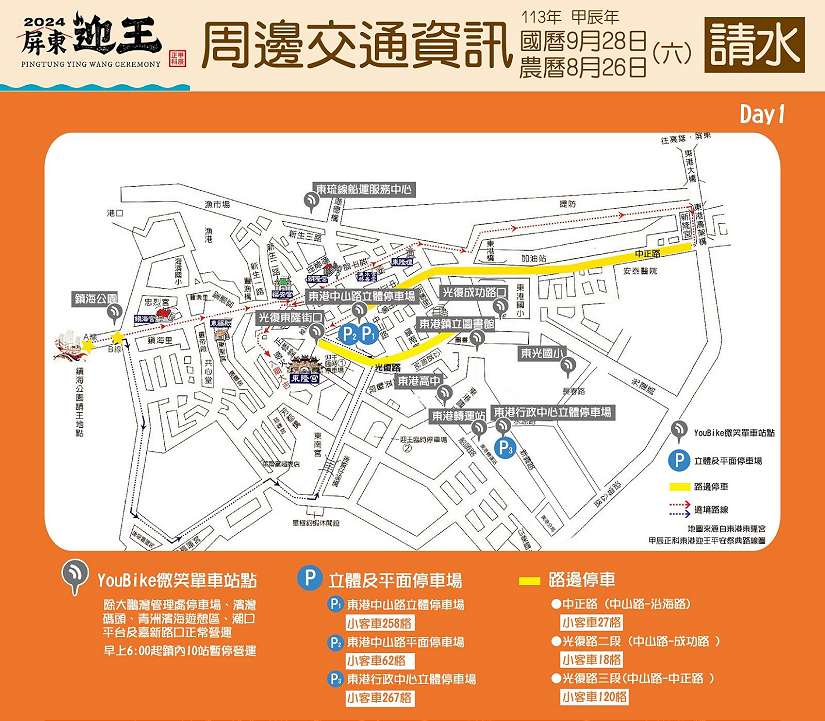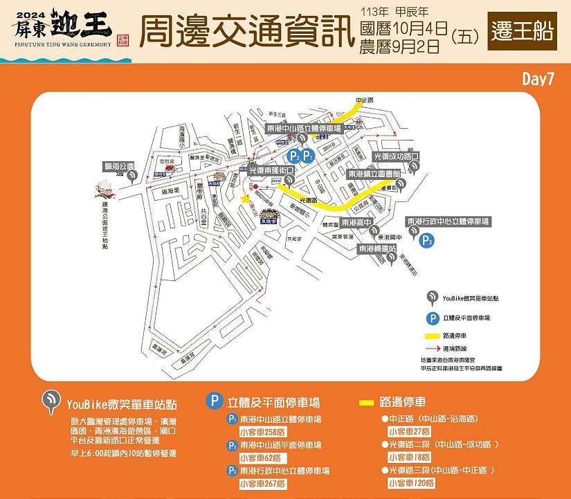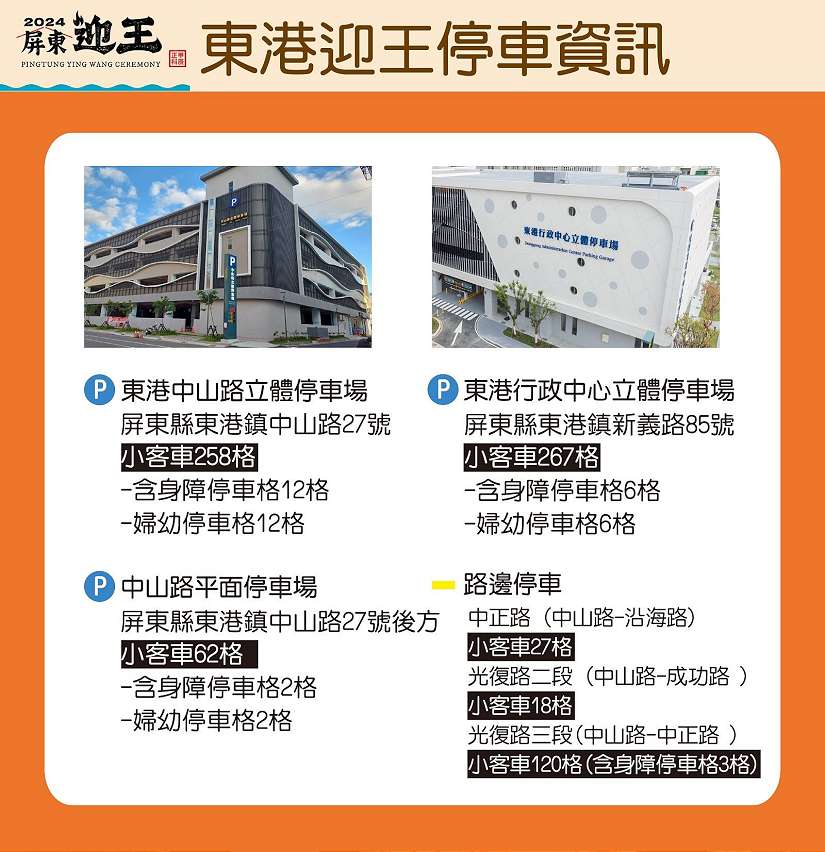 縣府交通旅遊處強調,為因應民眾參與迎王祭典之停車需求,鎮內包含「東港中山路立體停車場」、「東港行政中心立體停車場」、「東港中山路平面停車場」及中正路與光復路路邊停車格等,共計752格小型車停車格供車輛停放,一同體驗三年一科「東港迎王平安祭典」,來屏東感受迎王的熱情。