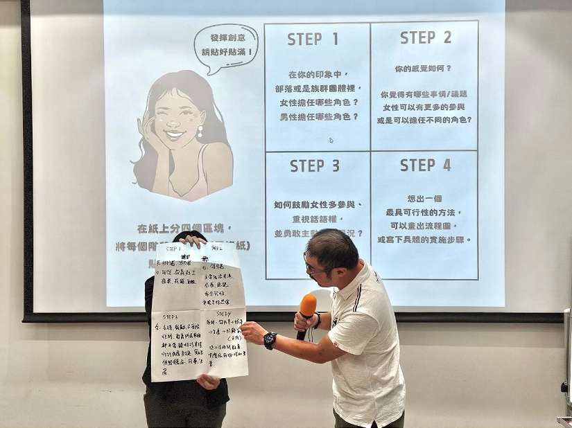 在講座的後半段,Drepelrange結合她的教學經驗,設計了互動活動,她請與會者思考:如何鼓勵更多女性參與公共事務、提升話語權,並勇敢地改變現況,讓每個參與者構思一個創意方案,並進行分享交流,這不僅加深了大家對活動精神傳遞的理解,也促進了彼此的互動。除此之外,Drepelrange還連結了國際女性的處境,提到雖然帛琉女性在其社會中扮演著重要角色,仍持續面臨家庭暴力、政治代表性不足,以及托兒服務缺乏等挑戰,尤其,每四位帛琉女性中,就有一位一生中曾遭遇過伴侶的身體或性暴力,然而社會對其支持系統仍薄弱。這些問題揭示了帛琉在推動性別平等方面,需要繼續努力的方向,也為台灣提供了借鏡參考。