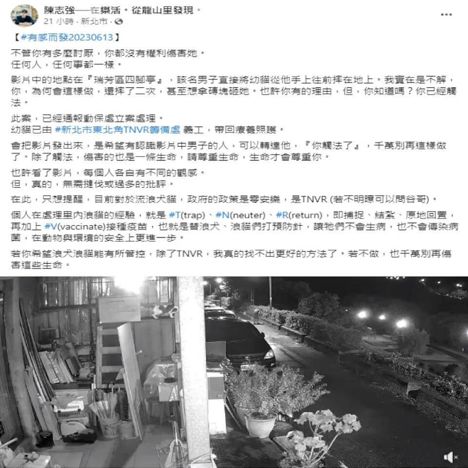 新北市瑞芳區龍山里長陳志強日前在臉書PO影片,指謫1名男子疑似虐貓的行為,他認為不管你有多麼討厭,都沒有權利傷害她(牠),任何人、任何事都一樣,而且那還只是1隻幼貓,目前受傷的幼貓已經由新北市東北角TNVR籌備處義工帶回照料,同時也通報動保處調查。