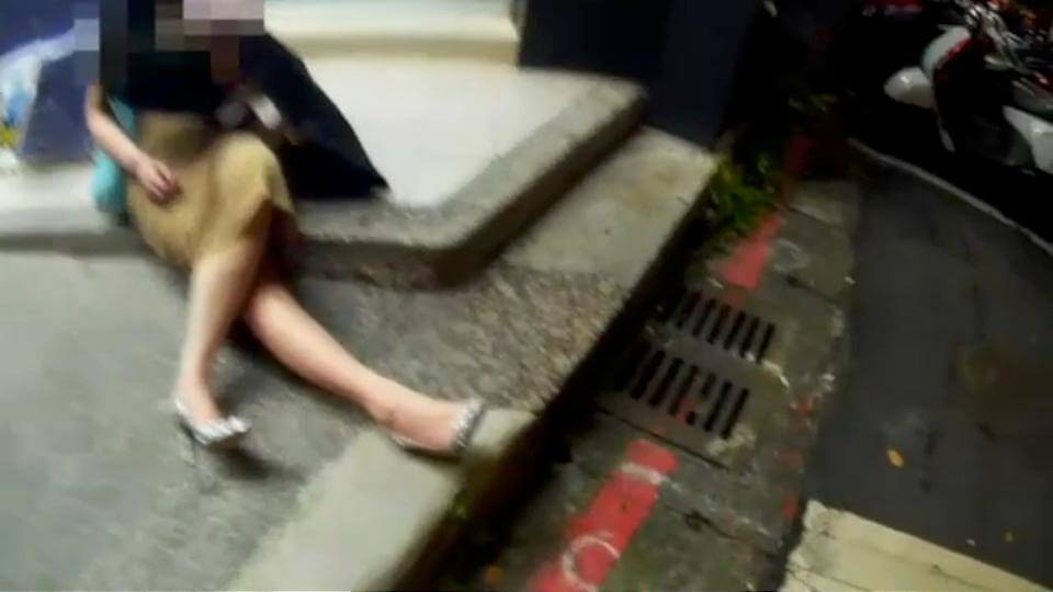 穿著緊身洋裝女子倒臥騎樓,員警上前關心。畫面讀者提供