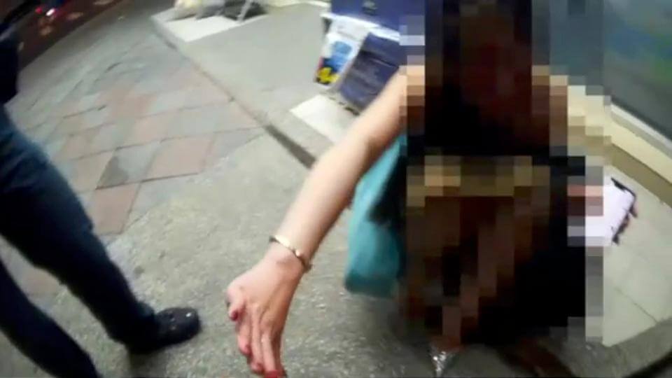員警關心女子倒臥騎樓,她還請求員警拉她站起來。畫面讀者提供