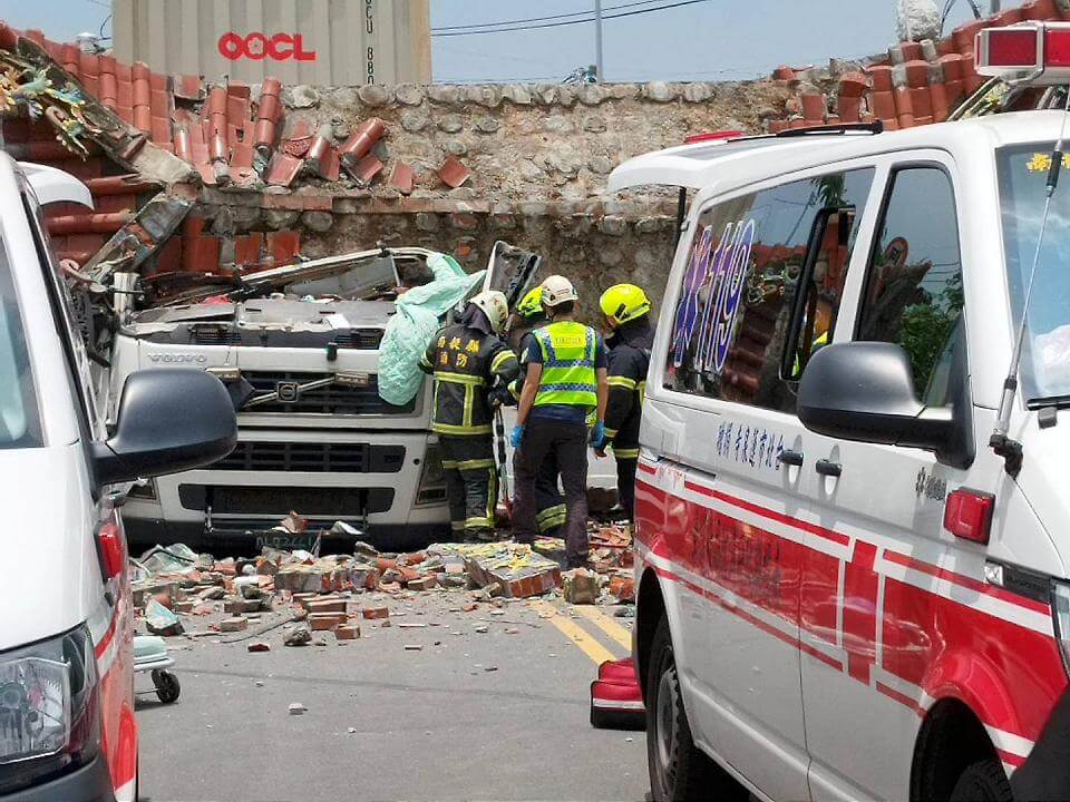 南投市南營路上慶福寺牌樓,20日上午疑遭1輛行經的聯結車撞倒,水泥牌樓直接倒向聯結車頭,將駕駛座內的2人壓住受困車內,警消獲報後前往搶救,但因水泥牌樓重量過重,最後找大型吊車協助,先將駕駛救出送醫,副駕駛座上的助手,還在持續搶救中。