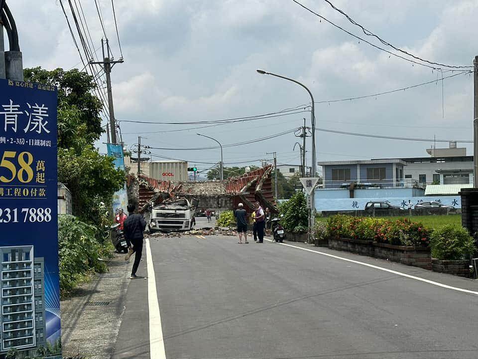 南投慶福寺牌樓疑遭聯結車不慎撞倒。翻攝南投人聊天室2.0臉書社團