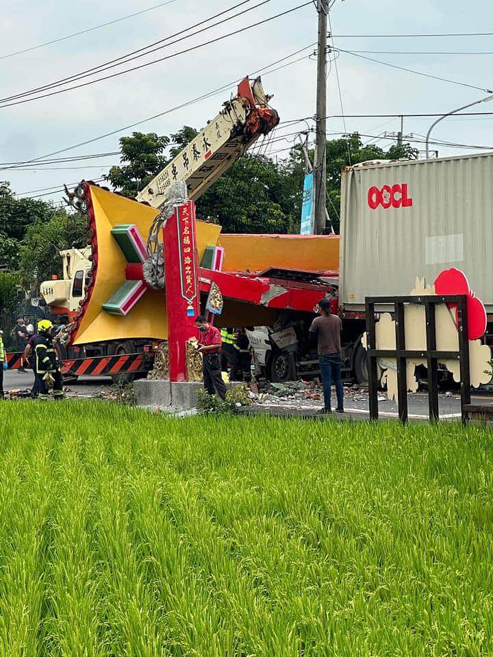 南投慶福寺牌樓將聯結車頭幾乎壓扁。翻攝南投人聊天室2.0臉書社團