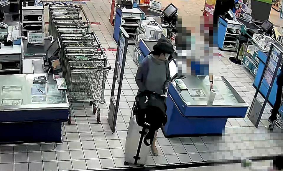 女竊賊將偷來的物品藏在大型包包內。畫面讀者提供