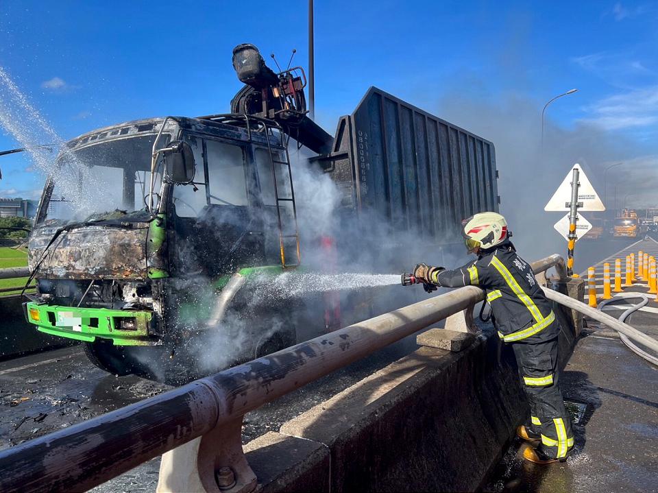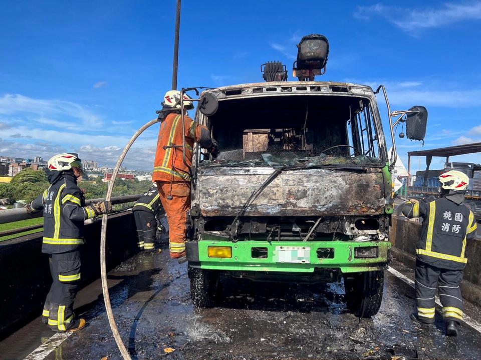 桃園市台66線東西向快速道路,1日清晨7時許發生火燒車意外,1輛行駛間的大貨車,不明原因起火燃燒,警消獲報後立即到場灑水灌救,所幸車上人員及時逃出,相關起火原因還要調查。