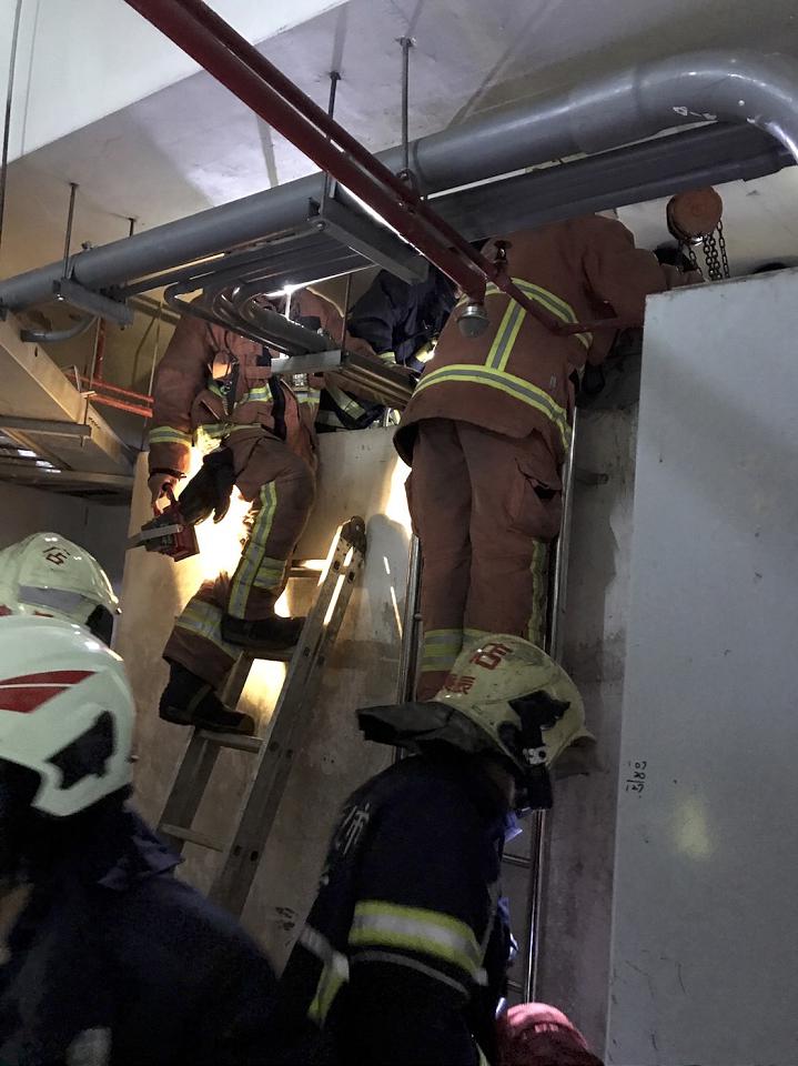 1名工人發生觸電,倒臥在儲水槽內,警消在狹小空間搶救。讀者提供