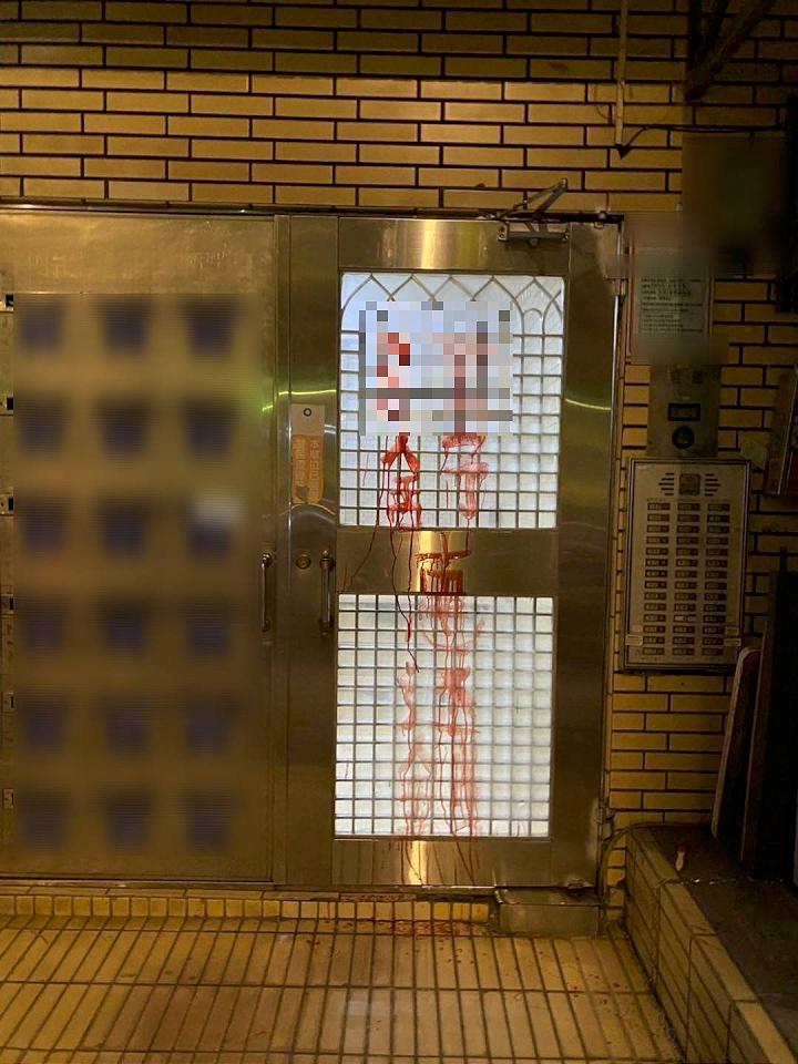 警方調查,這棟大樓門口不但遭人潑灑油漆,還被張貼「全家死光光」恐嚇字條,甚至門上用紅色油漆寫著某住戶還錢字樣,而且大樓附近還有不少印有這名住戶個資的紙張,並從監視器畫面中發現,有人騎車經過時,在大樓門口撒冥紙。