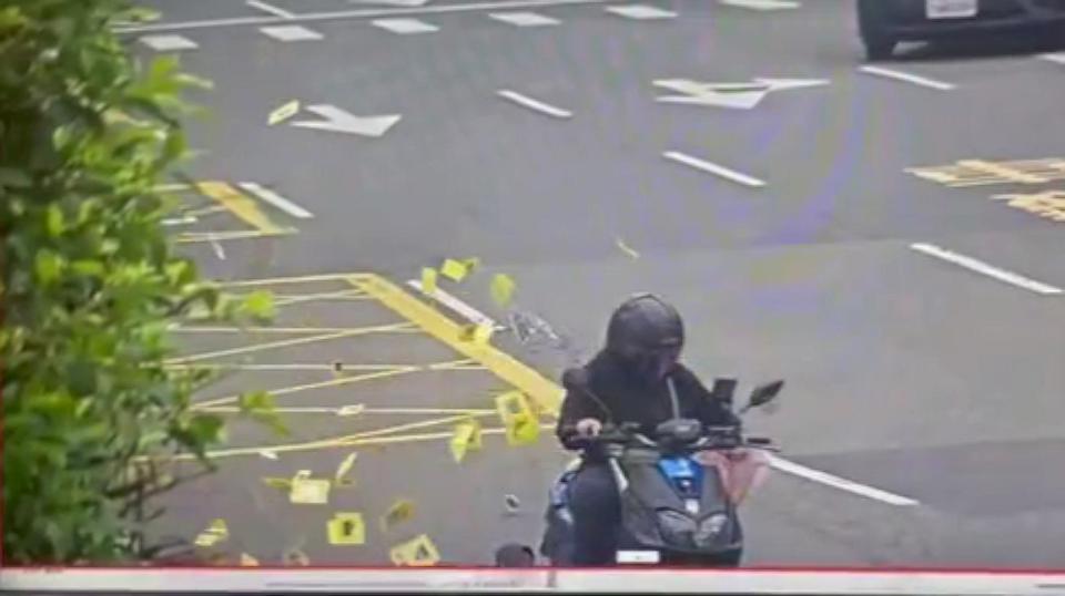 謝姓嫌犯騎車經過大樓時撒冥紙。讀者提供