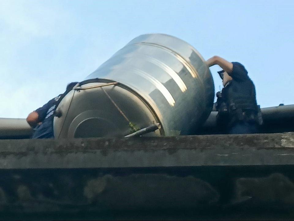 桃園警分局埔子派出所員警接獲水塔掉落報案,隨即趕赴現場先封鎖周邊路段,並上樓查看發現,水塔僅被一根電線拖著,隨時有砸落的危險,於是把電線剪斷合力將水塔搬到安全位置,20分鐘內解除危機,所幸另一個掉落的水塔並沒有造成傷亡。
