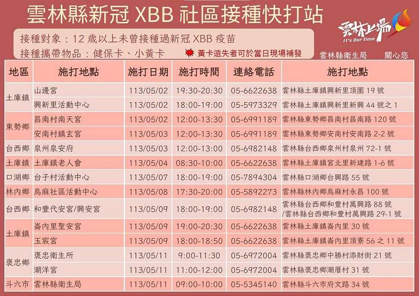 為方便縣民接種,提升疫苗涵蓋率,即日起至5月30日雲林縣特規劃新冠XBB疫苗免費接種服務,設置23場社區接種站,免收掛號費再加碼贈送精美好禮,另本縣有120家合約醫療院所分布於各鄉鎮(市),提供新冠XBB疫苗接種服務,院所接種日期、時間等資訊,歡迎登入雲林縣衛生局網站/疫苗地圖(網址: https://ylshb.yunlin.gov.tw/News.aspx?n=15251&sms=18466)查詢,以選擇方便接種的時間,前往就近的地點接種。