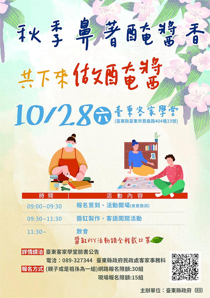 為推廣客家文化及美食,讓民眾認識客家獨特的醬缸文化,台東縣政府民政處10月28日在台東客家學堂舉辦「秋季鼻著醃醬香 共下來做醃醬」活動,其中,「親子共下來做醬缸DIY體驗」提供45個名額,採網路及現限場報名,歡迎共下來參加!