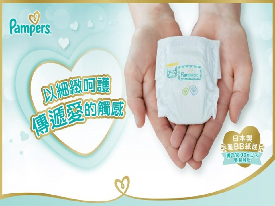 早產BB因為身形幼弱,且身上佈滿生命維持設備,因此更換尿片時需要更加謹慎且費時;一般初生兒紙尿片在尺寸與觸感上都無法符合早產BB需求外,早產BB尿片在香港也得來不易。Pampers與日本NICU護理人員共同研發早產BB紙尿片,除了細小的尺寸符合早產BB身型,材質也更加柔軟,給BB脆弱的皮膚帶來最細緻的呵護,也傳遞了父母對BB深切的愛。