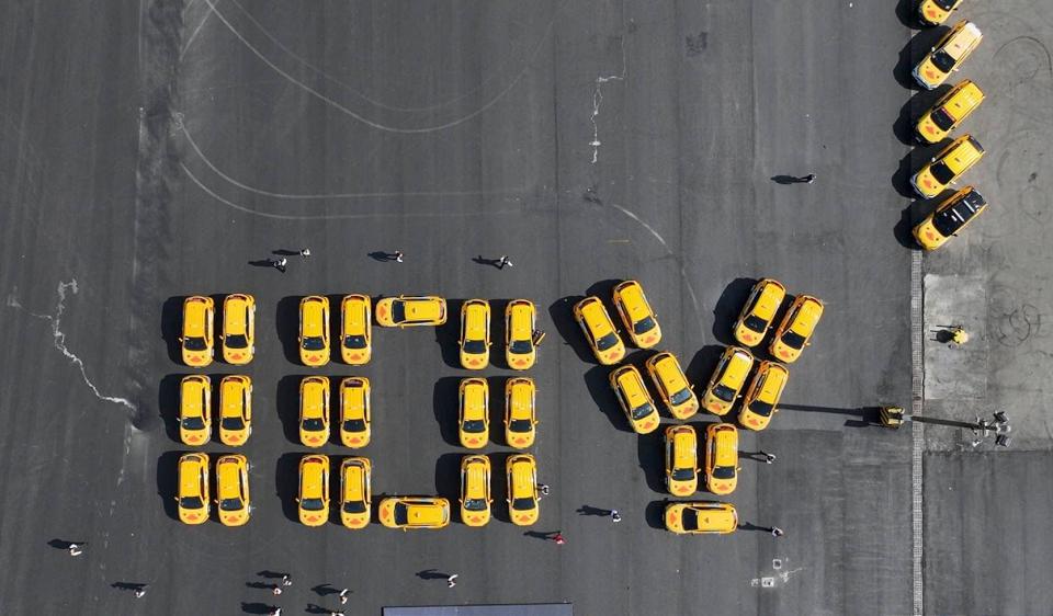 高雄計程車排列「10Y」圖案,象徵亞灣10年高雄蛻變。翻攝高雄市政府