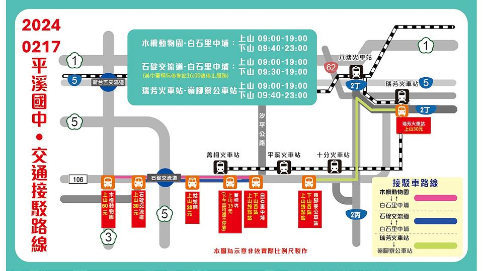 活動兩日往會場接駁公車收費採上車收費,2月17日(六)從木柵上車收費50元;從石碇交流道、姑娘廟、瑞芳火車站上車收費30元;從菁桐坑上車收費15元;2月24日(六)從木柵上車收費50元;從石碇交流道、姑娘廟、瑞芳火車站、基隆火車站、暖暖區公所、東興廟上車收費30元;從菁桐坑及平溪國中上車收費15元。兩日回程搭乘接駁車下山皆免收費。2月24日(六)接駁路線「雙溪火車站—十分基平橋」則全程免費,另接駁車不適用行政院TPASS月票優惠。(記者陳品綸/新北報導)