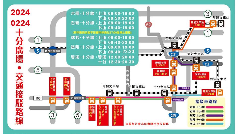 活動接駁車服務,民眾可從木柵動物園、石碇交流道、瑞芳、雙溪及基隆火車站,搭乘接駁車前往活動會場。2月17日(六)平溪場次市府安排3條交通接駁路線,分別為木柵動物園—白石里中埔線、國道5號石碇交流道—白石里中埔線,及瑞芳火車站—嶺腳寮;2月24日(六)十分場次提供5條交通接駁路線,分別為木柵動物園—十分南山橋、國道5號石碇交流道—十分南山橋、瑞芳火車站—十分基平橋、基隆火車站—十分基平橋,及雙溪火車站—十分基平橋。各線接駁車發車時間為9時至23時;19時後不上山,僅提供下山路線服務,回程末班車23時發車。其中,雙溪火車站—十分基平橋路線12時開始提供服務,回程末班車為20時30分。除接駁公車外,民眾亦可搭乘795、846公車前往會場,另846公車將於2月24日(六)停駛、社區巴士則於活動日16時後停駛。
