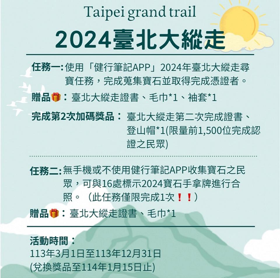 另外,今年也將維持去年轟動縱友界的第二回認證活動,鼓勵縱友們挑戰台北大縱走第二回,前1500名完成者,可獲得獎品登山帽一頂,以限量方式增加挑戰刺激性,讓縱友每次挑戰,都能留下深刻印象。有興趣的朋友,現在就可以開始規劃台北大縱走的旅程囉!無論你是喜歡徒步旅行的愛好者還是尋求挑戰的登山凹豆咖,這都是獨一無二的機會,讓你能探索這座城市美麗和多樣性。(記者黃子瑋/台北報導)