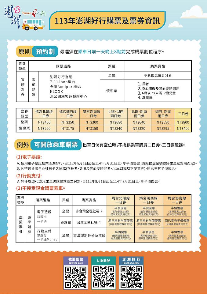 澎湖縣政府整合3條好行路線北環線、湖西線及澎南線,推出2日券及3日券優惠,具優惠身分的長者、身心障礙者及必要陪同者、6歲以上未滿12歲兒童以及澎湖籍,2日券及3日券優惠價格可再減半;但旅遊處也提醒,使用電子票證可享半價優惠購買1日券,原已享有半價優惠票不再提供優惠,無法購買2日券及3日券,民眾購買時要留意優惠條件。